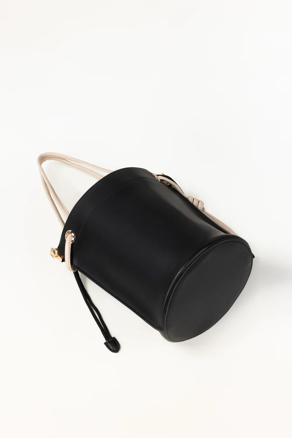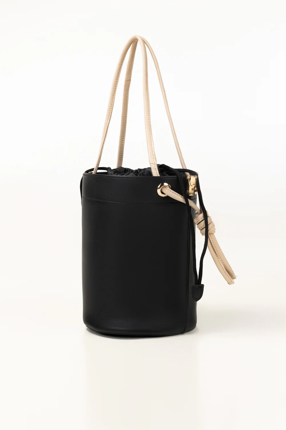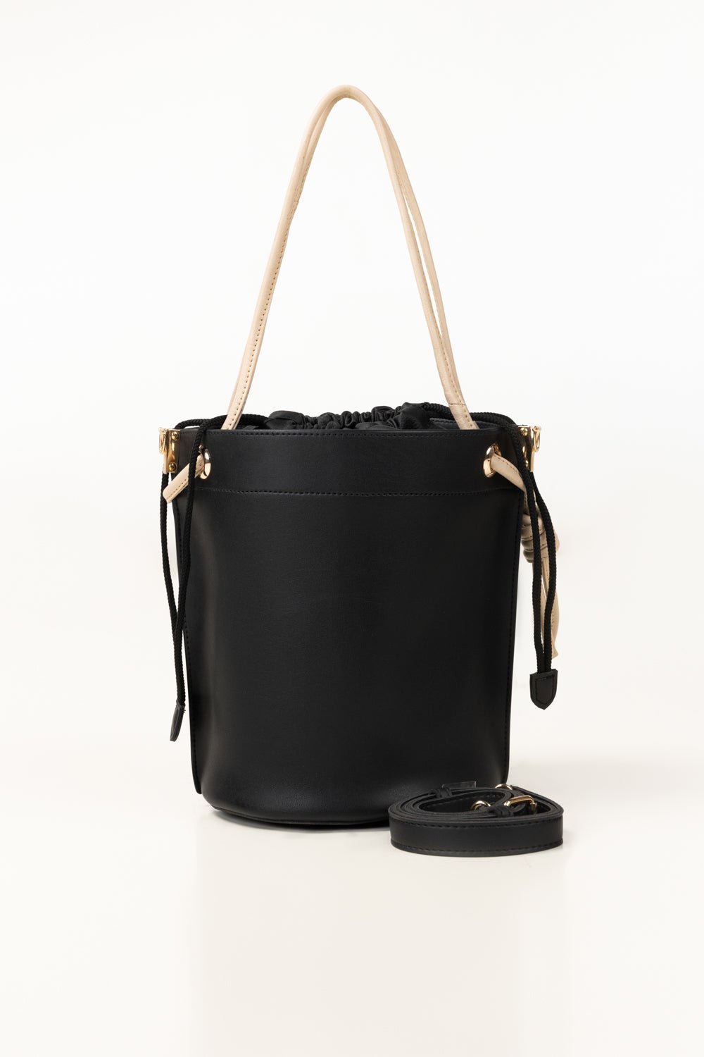 A sleek bucket-style handbag in faux leather with contrast handles and a drawstring closure accented by gold-tone hardware. Designed with a roomy interior and clean, modern silhouette, it includes a detachable strap for easy hand or crossbody wear.