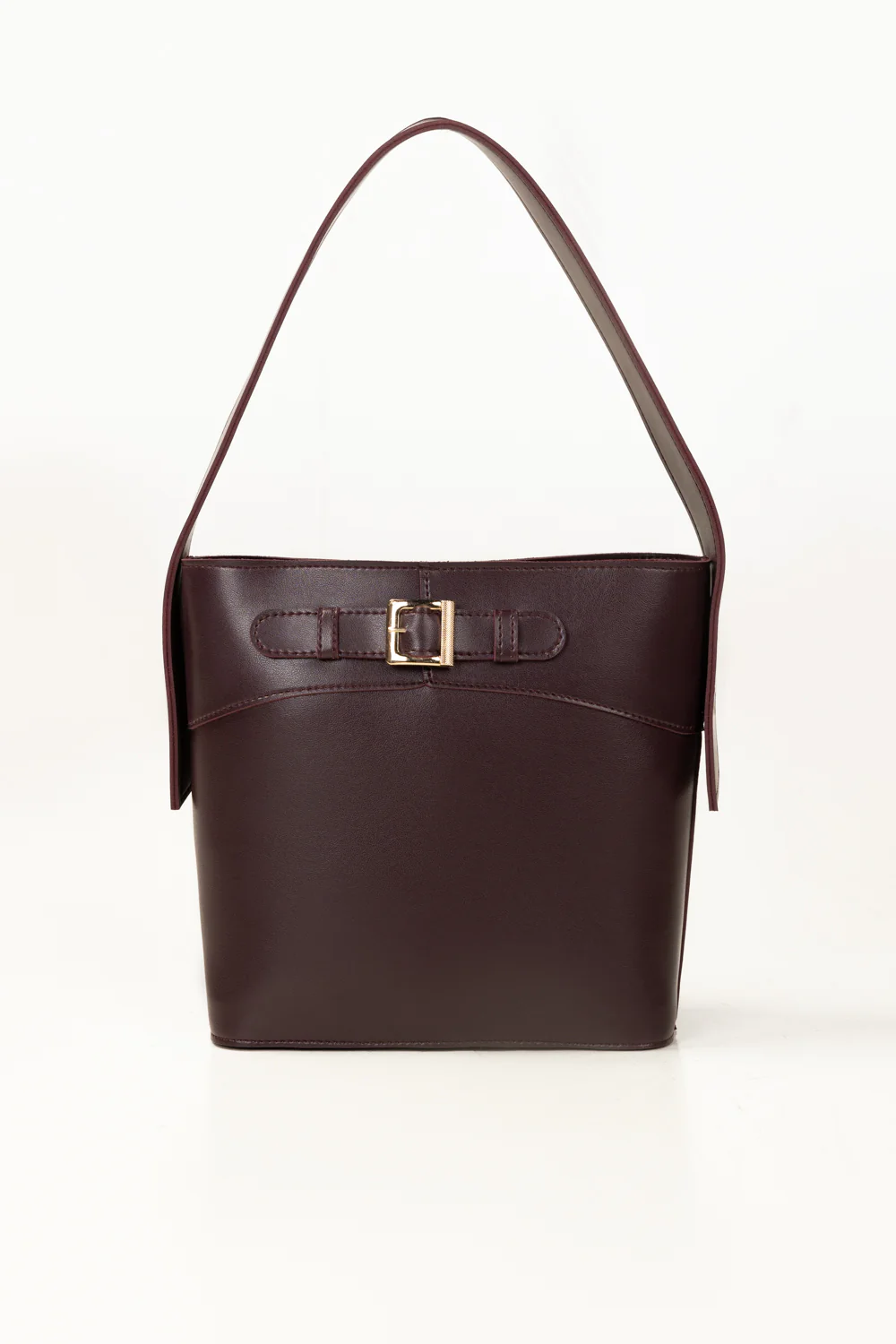 Elegant maroon faux leather bucket bag with a sleek, structured silhouette and silver buckle detail. Includes a detachable adjustable strap for versatile wear. Perfect for elevating both every day and formal looks.