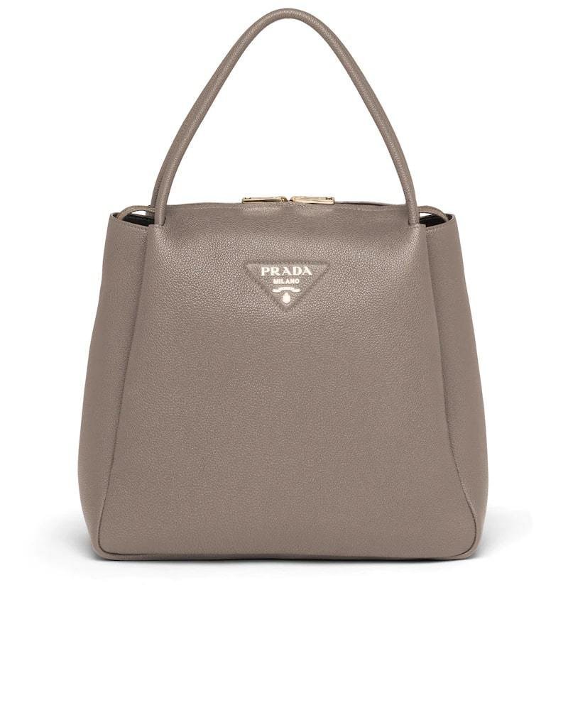 Made of soft calfskin, an expression of the brand’s artisan expertise, this medium-sized handbag introduced for the Fall Winter 2020 collection presents a new interpretation of the triangle logo formed by stitching with the Prada metal lettering logo illuminating its center. The reverse stitching emphasizes the soft, rounded image of the silhouette, completed by the double handle and zipper closure. Nappa lining with a center compartment and two pockets completes the interior.