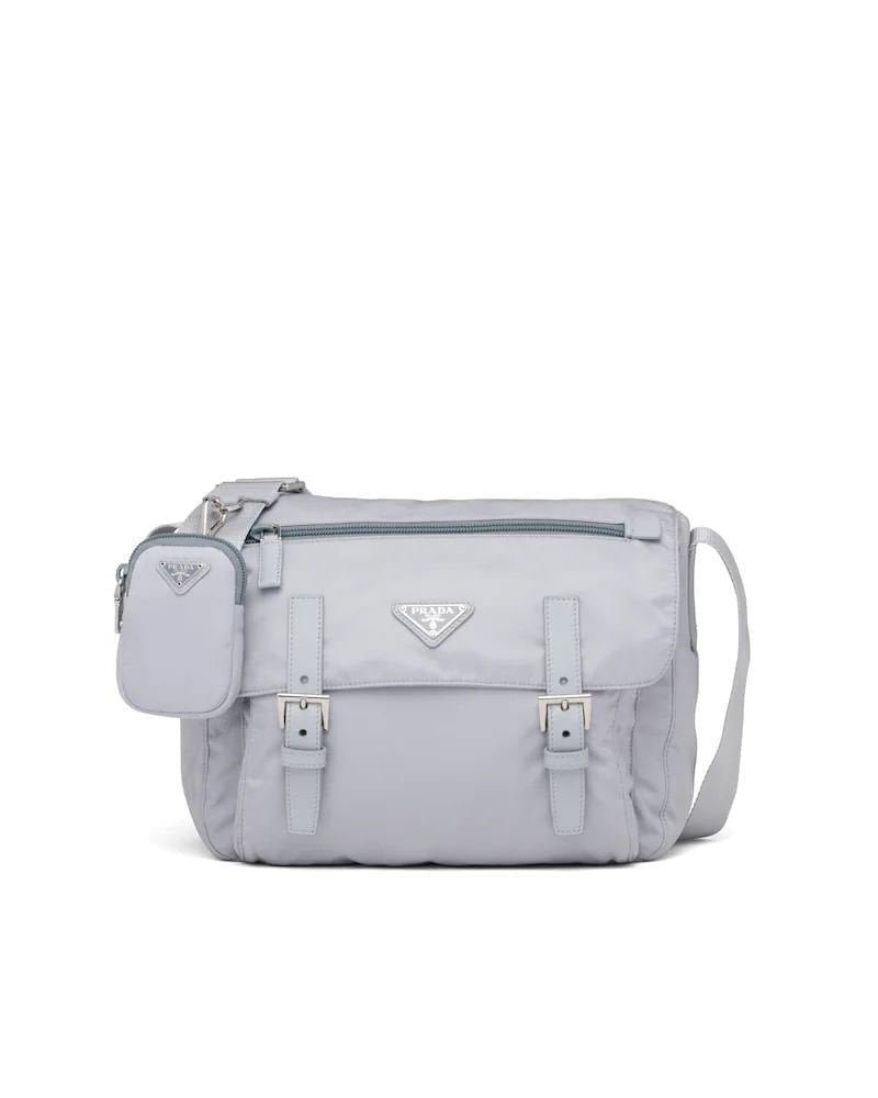 This shoulder bag with roomy compartments and pockets is made of Re-Nylon: a regenerated nylon yarn (ECONYL®)produced from recycled, purified plastic trash collected in the ocean, fishing nets and textile waste fibers. The design is enhanced with a detachable pouch, a distinctive accessory of Prada collections.