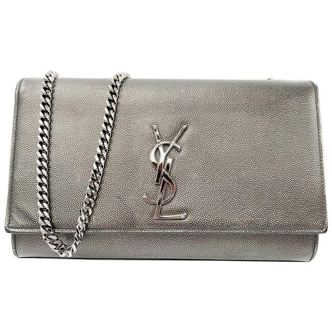 A monogrammed insignia makes an iconic mark on a pristine shoulder bag expertly crafted in Italy from pronouncedly pebbled calfskin with a metallic sheen.