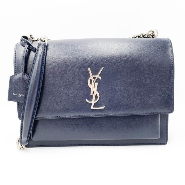 We guarantee this is an authentic SAINT LAURENT Calfskin Large Monogram Sunset Dark Blue or 100% of your money back. This stunning shoulder bag is crafted of calfskin in dark blue. The bag features a silver chain strap, a front facing flap with a signature silver YSL logo, gusseted sides and both an interior and exterior pocket. This fold over bag is complete with magnetic snap that opens to a dark blue suede interior. This cross body bag is ideal for daytime or evening wear only from Saint Laurent!