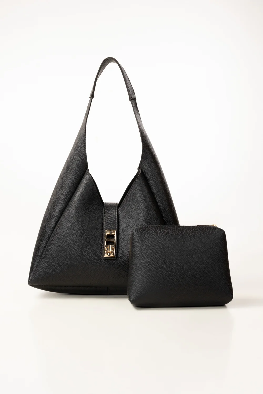 Black textured faux leather shoulder bag with inner pouch. Crafted from pebbled faux leather, it features a soft, slouchy silhouette with a modern edge. The bag secures with a front flap and a gold-tone twist-lock closure, adding a refined detail to the minimalist design.