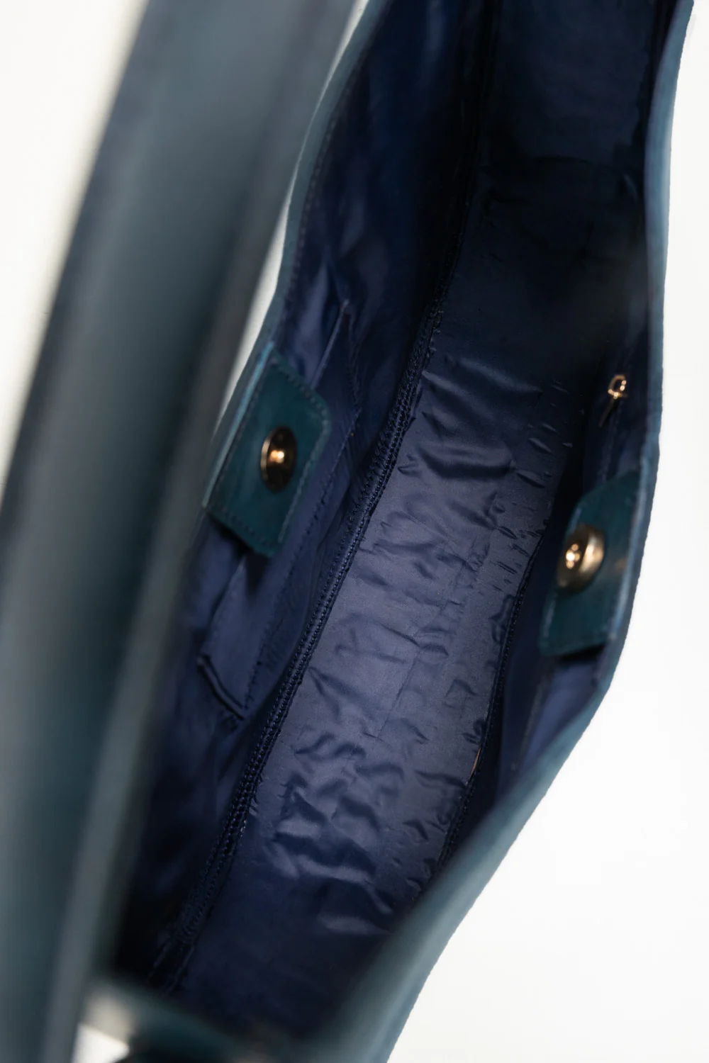 Sleek and modern, teal shoulder bag features a unique curved silhouette with a subtle V-cut opening. Crafted from soft suede-like material, it offers a minimalist design with a wide, comfortable strap. Perfect for day-to-night wear, adding an elegant edge to any outfit.