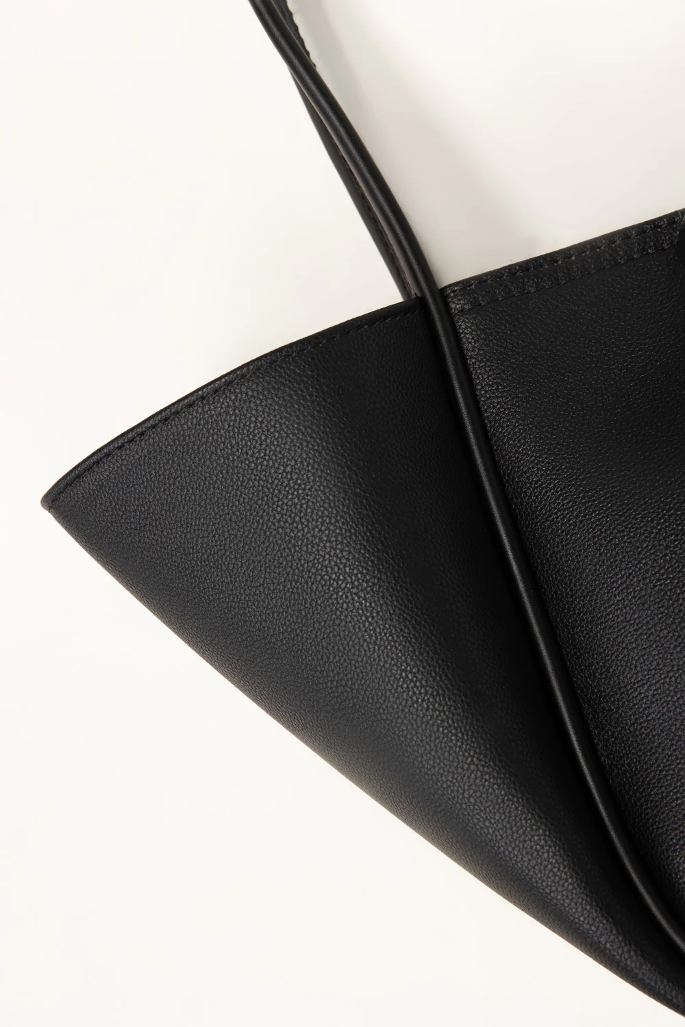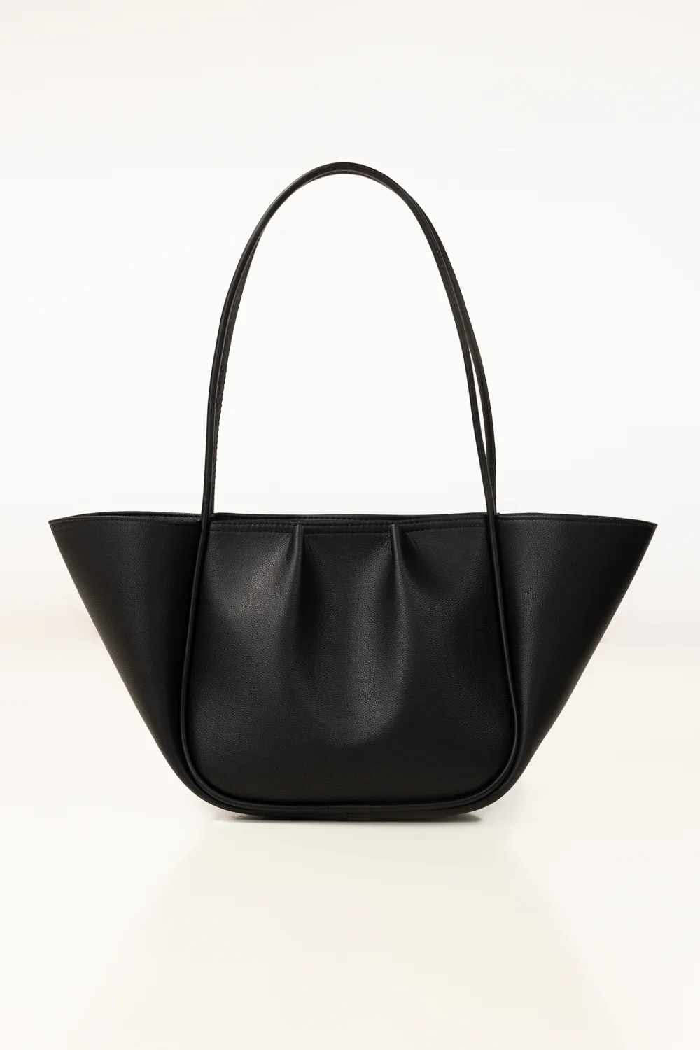 This elegant black tote bag features a structured silhouette with soft pleated detailing for a modern look, crafted from smooth faux leather with a spacious, fabric-lined interior and a secure zip pocket. Comfortable shoulder straps and a minimalist design make it ideal for everyday use, whether for work, shopping, or casual outings.