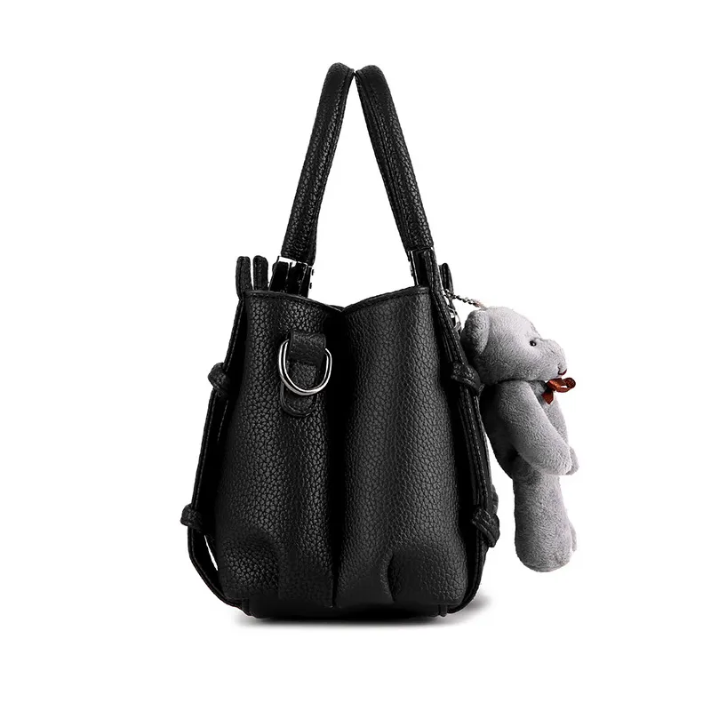 Made from textured PU leather, it includes sturdy double handles, an adjustable shoulder strap, and a cute detachable teddy bear charm for added personality.